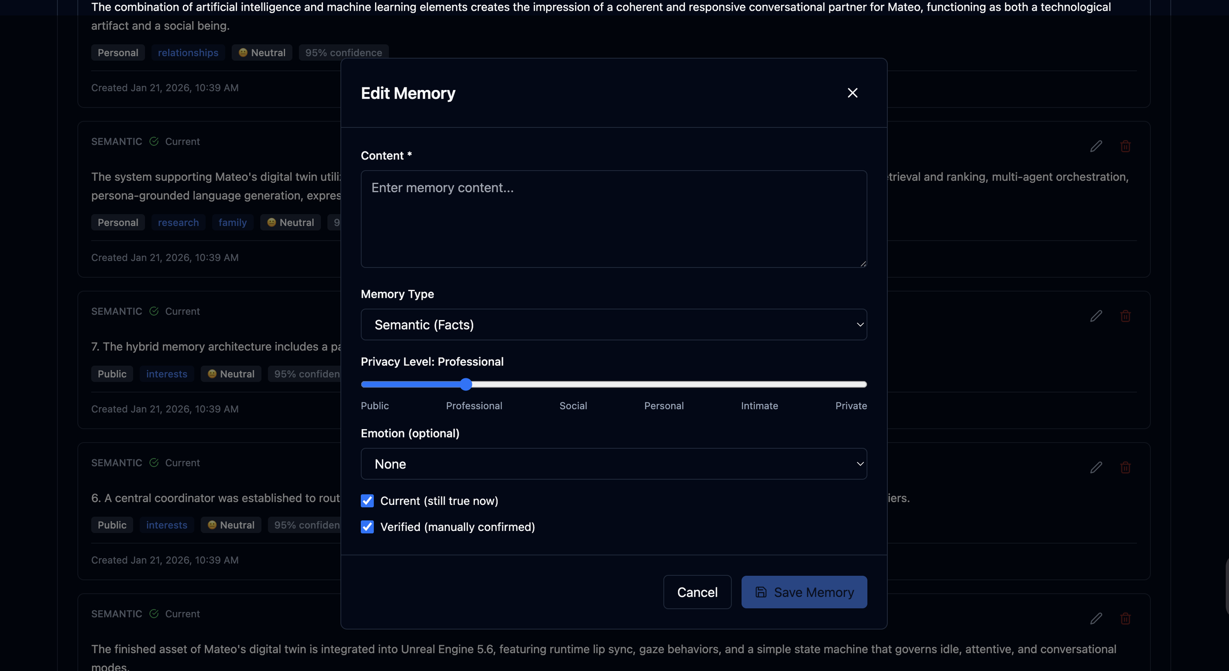 Add, edit, delete, or classify memories manually or automatically. Use smart filters to control which memories the twin can access in each conversation.